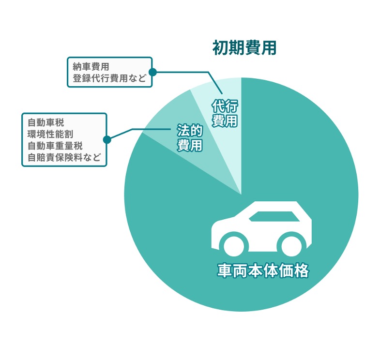 下の円グラフでは、初期費用のおおまかな内訳を示しています。車両本体価格が大部分を占める一方で、法定費用や代行費用も一定の割合を占めていることがわかると思います。