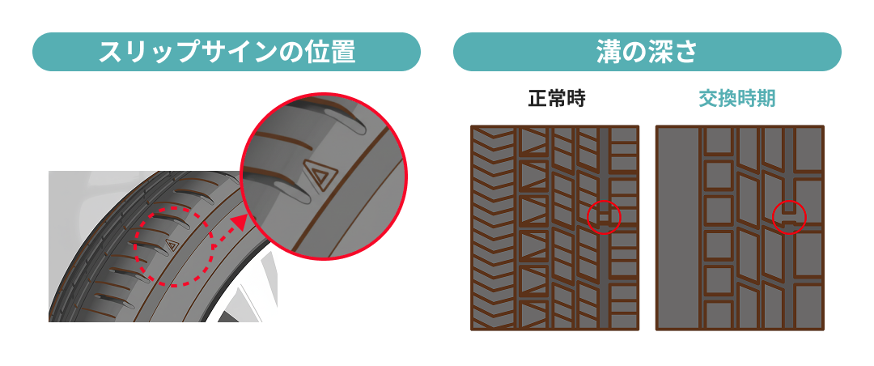 タイヤの溝には、残り溝が1.6mm以下になったことを知らせる「スリップサイン」と呼ばれる印があります。