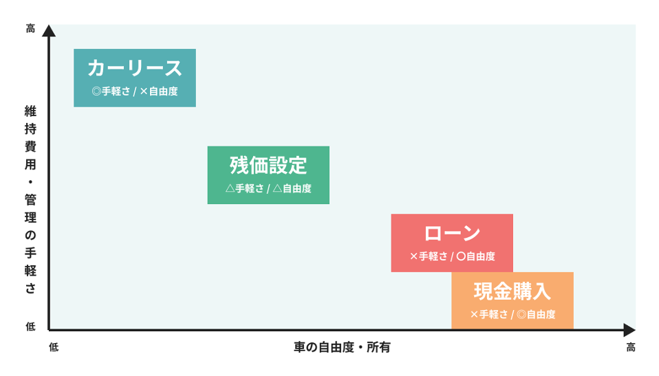 以下の図では「維持費・管理の手軽さ」と「車の自由度・所有度」のバランスから、3つの乗り方を比較しています。