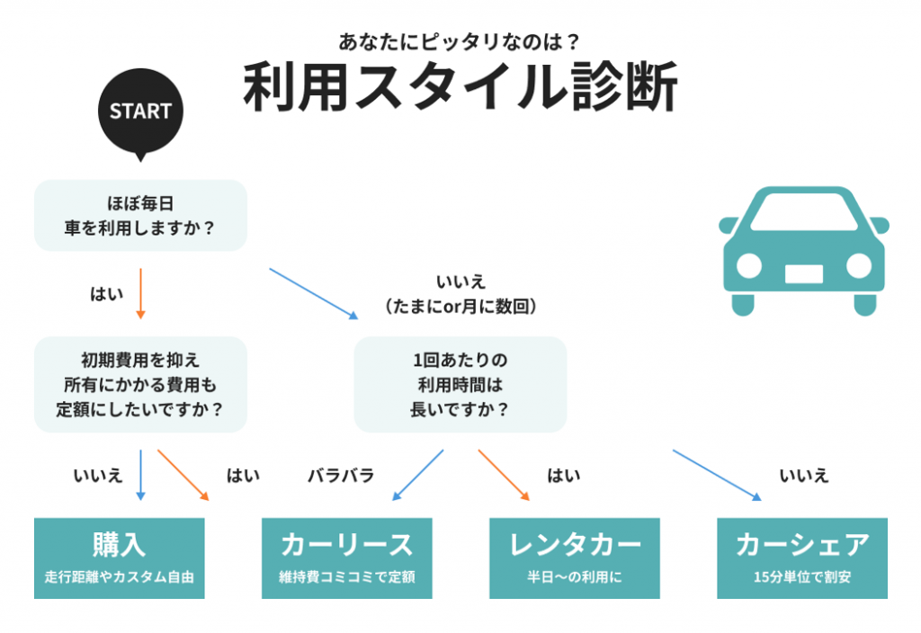 「車を買うべきか、借りるべきか」「自分に合う使い方がわからない」という方は、まずはこちらのチャートでチェックしてみましょう。質問に答えていくだけで、ご自身にぴったりの選択肢がわかります。