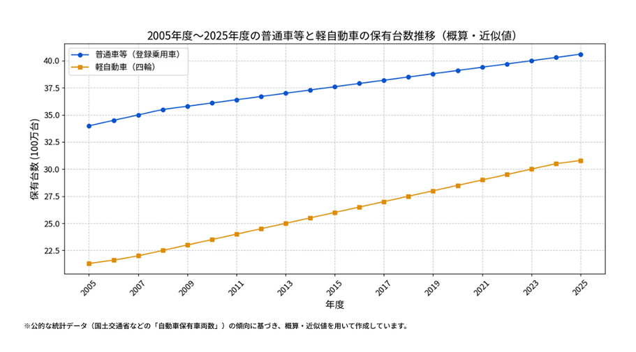 以下のグラフは、2005年から2023年までの普通車と軽自動車の保有台数の推移を示したものです。軽自動車の台数が年々増加していることがわかります。