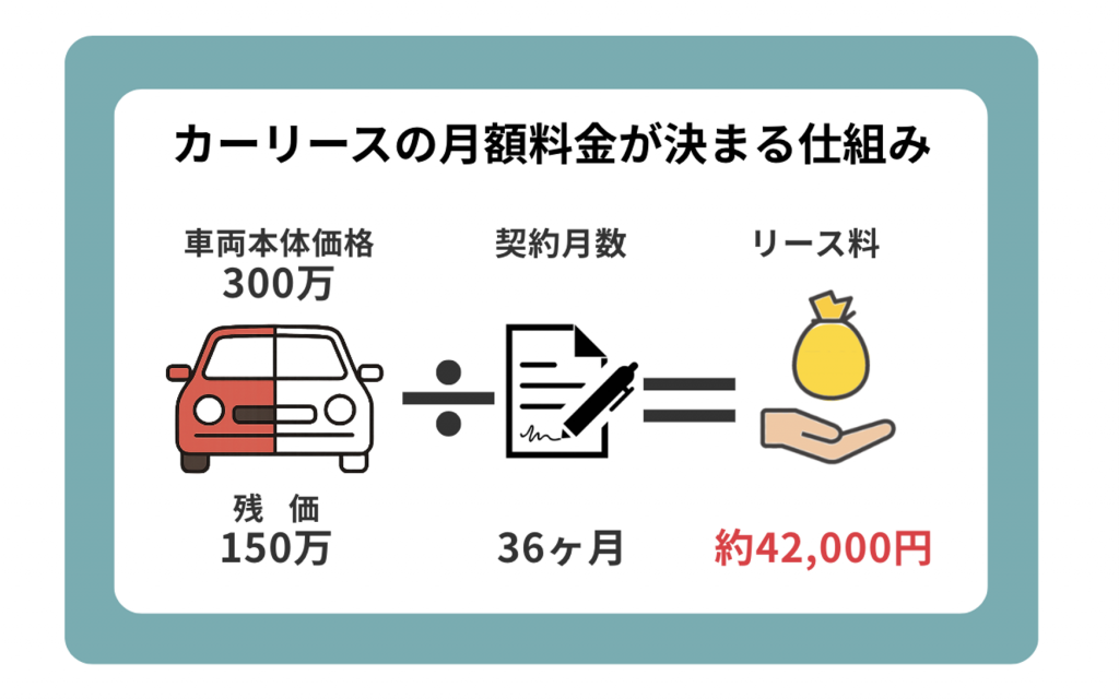カーリースとは、車両本体価格から契約満了時の車の価値(残価)をあらかじめ差し引き、その残りの費用を契約月数で割って月額料金を算出する仕組みです。これに、税金や保険料などの諸経費をすべて含めることで、月々定額で新車に乗れるサービスとなっています。
