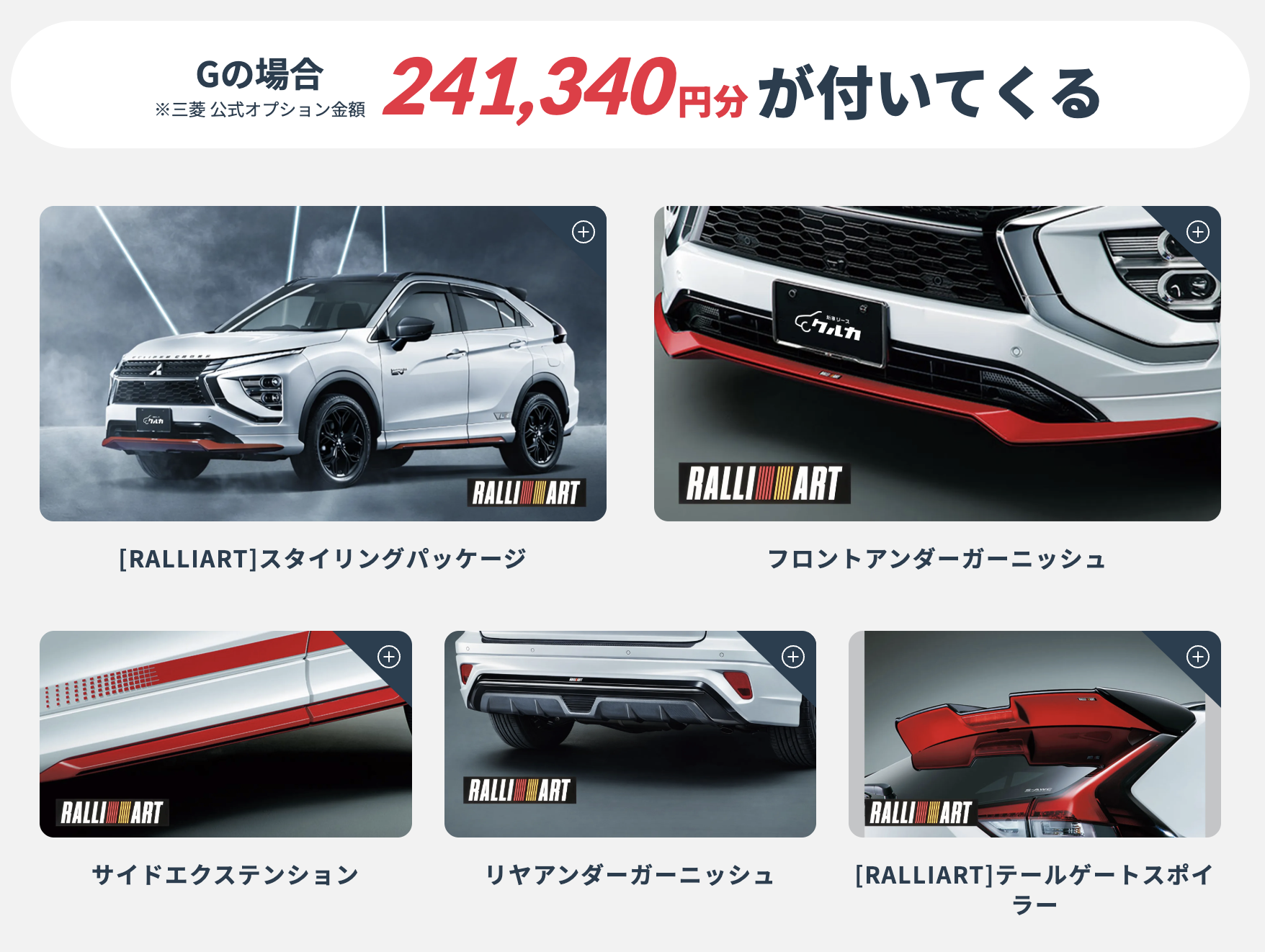 エクリプスクロス(Gグレード)なら、三菱公式オプション合計241,340円分のRALLIARTエアロパーツが標準装備されます。「見た目にこだわりたいけど、オプション費用がネック」という方にとっても、圧倒的なコストパフォーマンスをご実感いただける内容です。